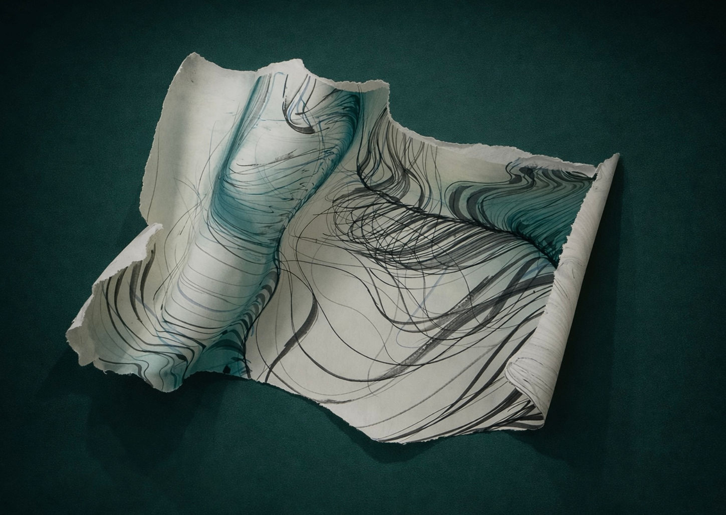 Papier, Linie und Bewegung spannen sich über 669 cm und machen den Raum selbst zur Zeichnung. Die Installation folgt der Architektur wie ein stiller Verlauf – präzise, reduziert und körperlich spürbar.
