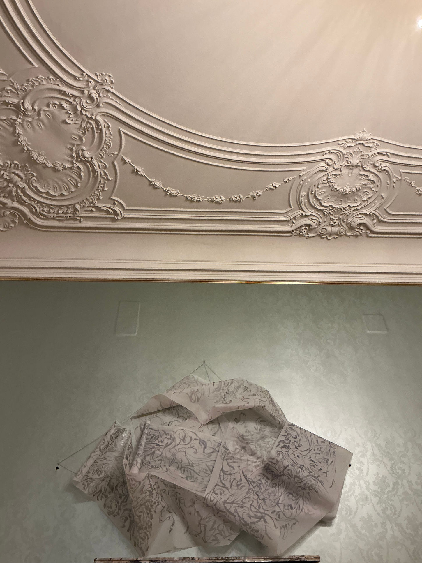 Papierinstallationen in einen spannungsvollen Dialog mit der prunkvollen Architektur.